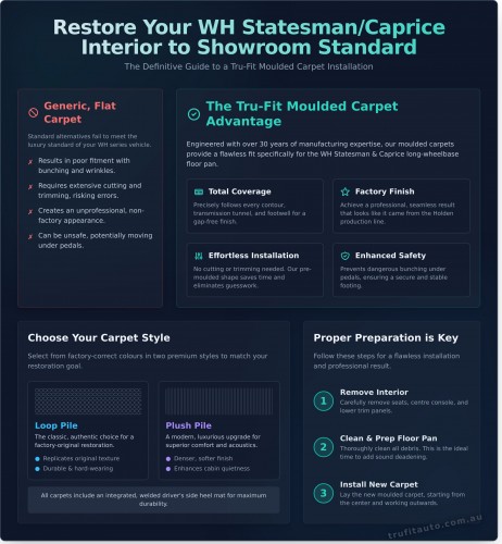 At Tru-Fit, we understand that a true restoration is comprehensive. That’s why we supply a full range of interior trim components to complement our moulded carpets. By addressing these final details, you elevate your project from a simple repair to a professional-grade restoration. Explore our full range of products for your wh statesman caprice at trufitauto.com.au to ensure every element of your interior is perfect.